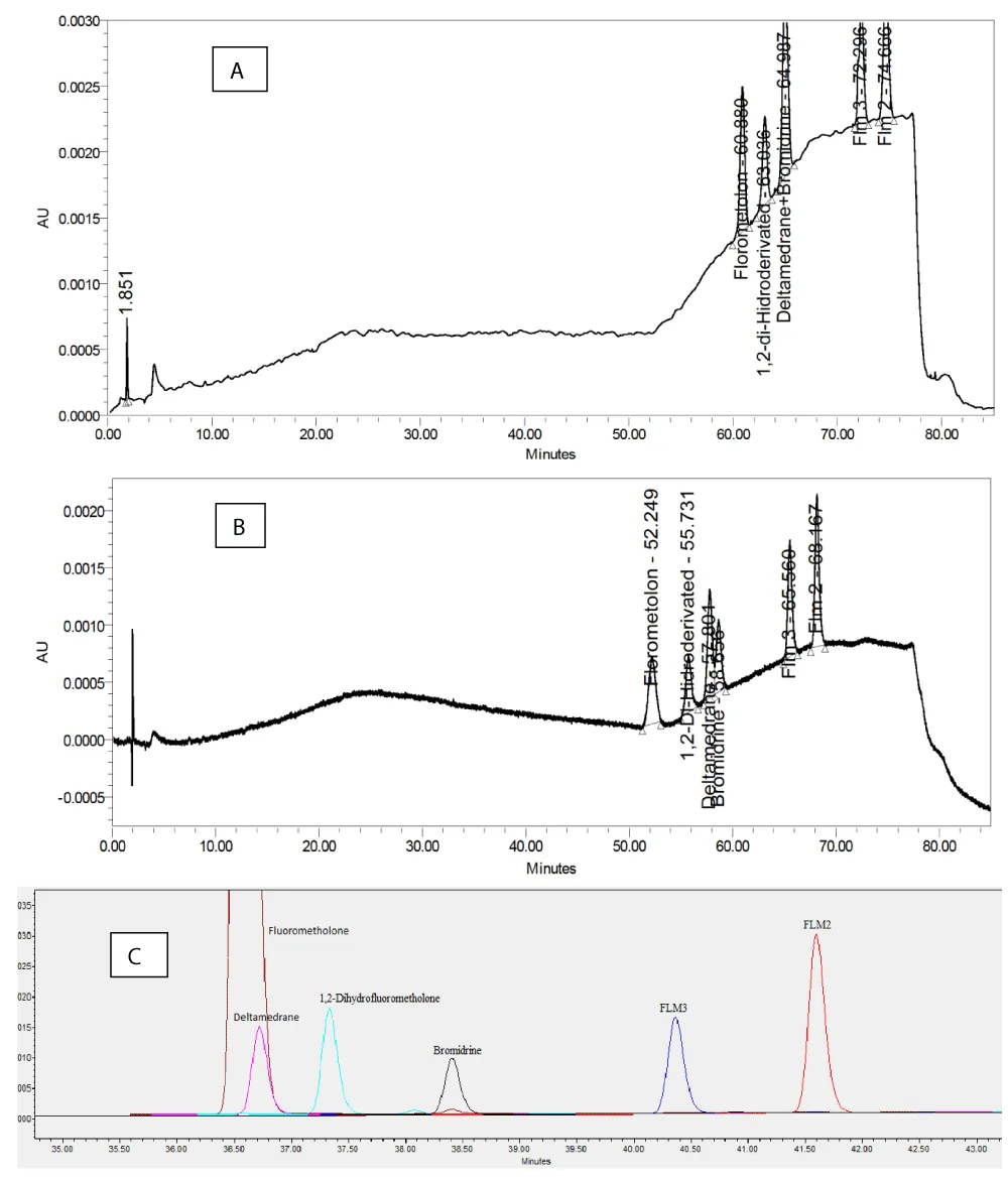 Fluorometholone, impurities, and ophthalmic solution containing FLM and tetrahydrozoline hydrochloride sample were taken from commercial batches produced by the World Medicine Pharmaceutical Industry and Trade Inc. (Istanbul, Turkey). Analytical reference standards used during development and validafollows and their purities given in parentheses; fluorometholone (99.32%) and impurities Deltamedrane (95.7%), 1,2-Dihydrofluorometholone (100.0%), Bromidrine (100.0%), FLM2 (96.8%), FLM3 (100.0%). Sodium hydroxide (NaOH), hydrochloric acid (HCl), hydrogen peroxide (H2O2), triethylamine (Et3N), potassium dihydrogen phosphate, and o-phosphoric acid were purchased from Merck, methanol from J. T. Baker, and tetrabutylammonium hydroxide solution (40%) from Acros. HPLC-grade water (0.05 µc) was produced by the Sartorius Stedim Biotech system.