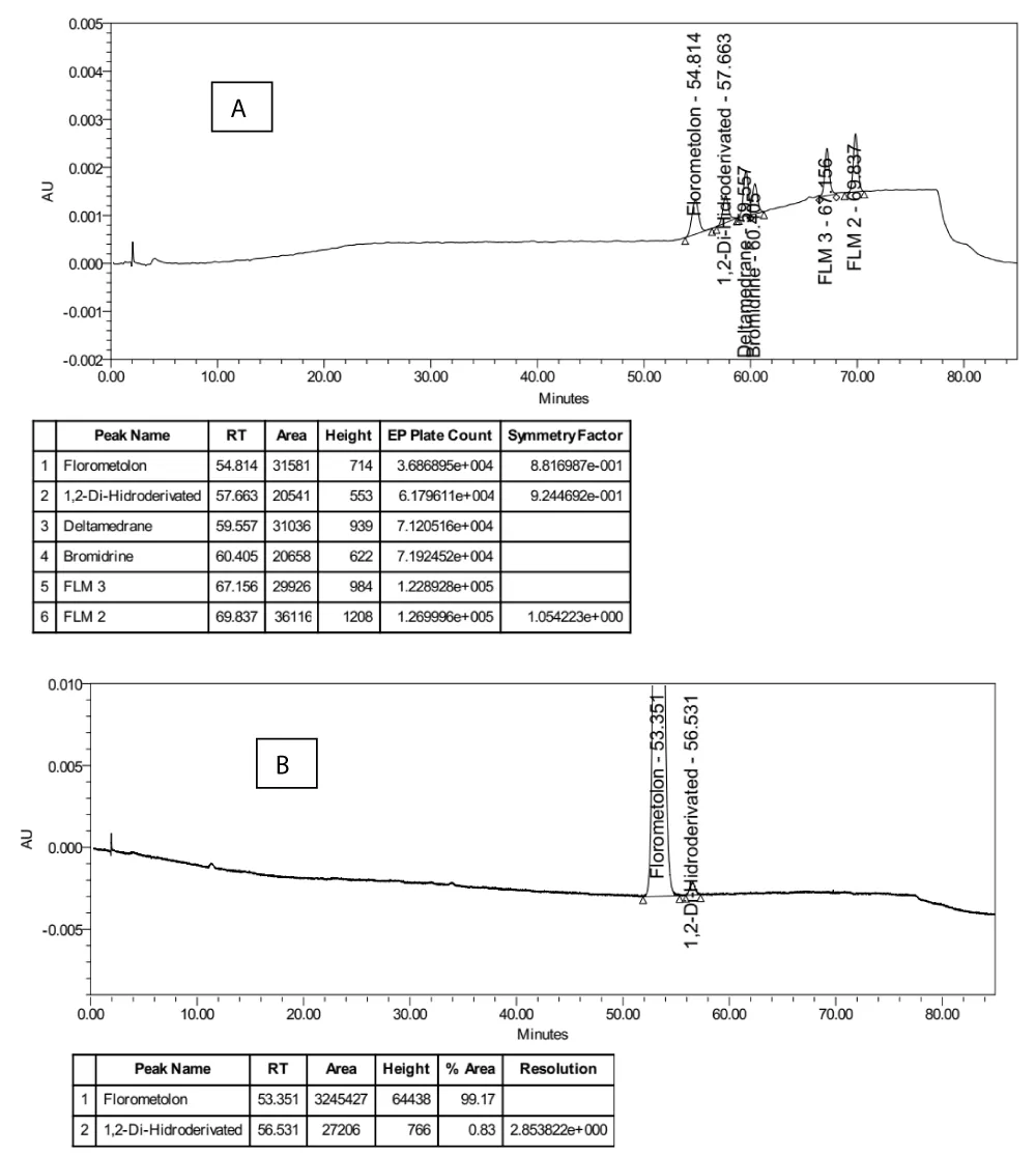 Stress-testing and stability studies: The ophthalmic solution containing FLM and tetrahydrozoline hydrochloride sample were subjected to stress-testing under the following conditions: thermal degradation (standing at 60 °C 14 days), photolytic degradation under day-ligat 25 °C for 14 days, acidic hydrolysis (standing at 5.0 M HCl solution at 25 °C for 14 days and at 60 °C for 14 days), alkaline hydrolysis (standing at 5.0 M NaOH solution at 25 °C for 14 days and at 60 °C for 14 days), and oxidative degradation (standing at 30% H2O2 solution at 25 °C for 14 days). The acidic, basic, and oxidative hydrolysis solutions were neutralized by using 5.0 M NaOH, 5.0 M HCl, and 30% tetrabutylammonium solutions. For each study, corresponding blank solutionanalyzed to determine the formed degradation impurities and.