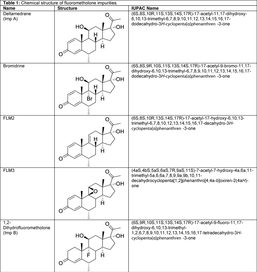 The pharmacopeia survey finds that analytical methods are reported for solutions drops in British (BP) [4], US (USP) Pharmacopeias, and cream, ophthalmic suspension, and ointment only in USP [5]. It is not reported related substances method is used for cream and ointment. Known impurities are not defined for ophthalmic solutions and suspensions in both USP and BP. For the FLM raw material monograph, only the USP identifies one of the known impurities, which is FLM-related compound A (Table 1). In this method, five FLM impurities (Table 1) were successfully separated from each other and detected. Analytical methods for the determination of fluorometholone in drugs were described, including HPTLC for impurity [6], UV spectrophotometry [7], TLC-spectrodensitometry [7], and HPLC for assay [2,9].