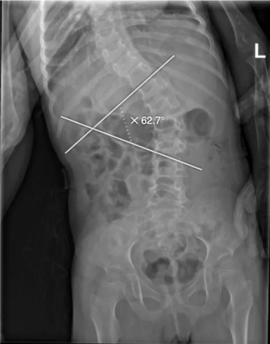 Figure 2: Spine X-ray showing scoliosis with a Cobb angle of 62.7°, indicating a severe spinal curvature.