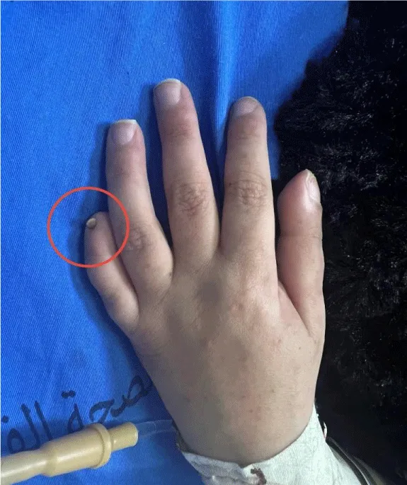 Figure 3: Hypoplastic nail of the fifth finger (red circle), a feature associated with OTUD6B mutation.