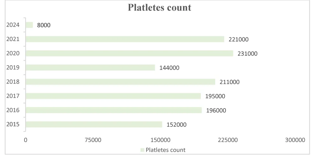 Figure 5: Patient’s platelet count trend over the years. The graph illustrates a significant drop in platelet count in 2024 (8000/µL) compared to previous years, where values remained within the normal range.