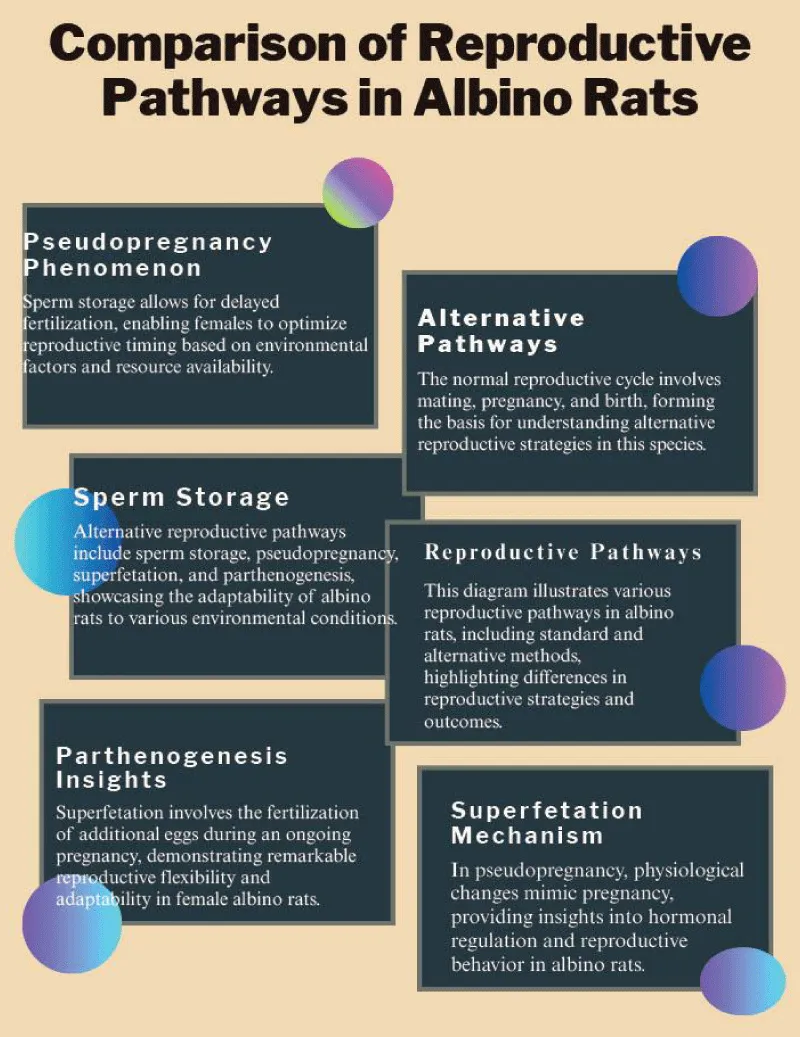 Figure 1: Comparison of reproductive pathways in albino rats, highlighting standard and alternative mechanisms including pseudopregnancy, sperm storage, superfetation, and parthenogenesis. The figure illustrates the physiological adaptability of albino rats to diverse environmental conditions through multiple reproductive strategies.