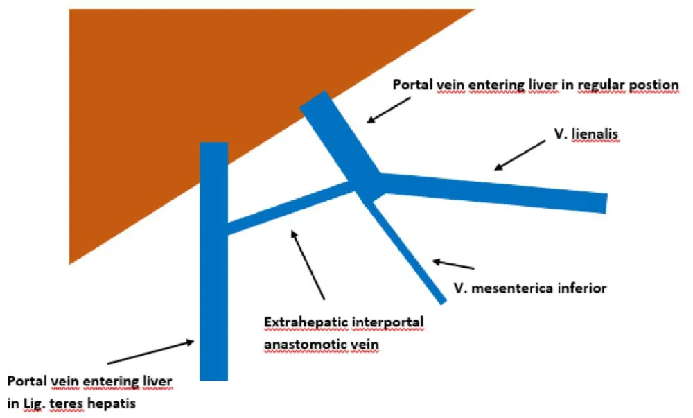 Figure 1: Schematic depiction of the anatomical variation of the extrahepatic portal vein in the presented case.