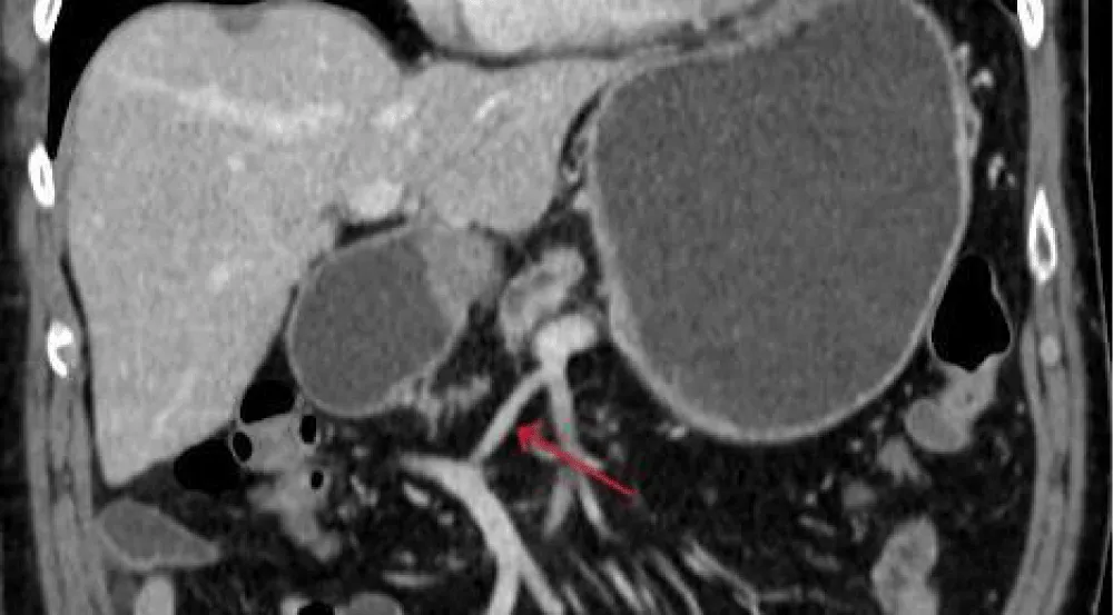 Figure 3: CT scan presenting a second portal vein forming from V. mesenterica superior, entering the Liver via the ligament. Teres hepatis.