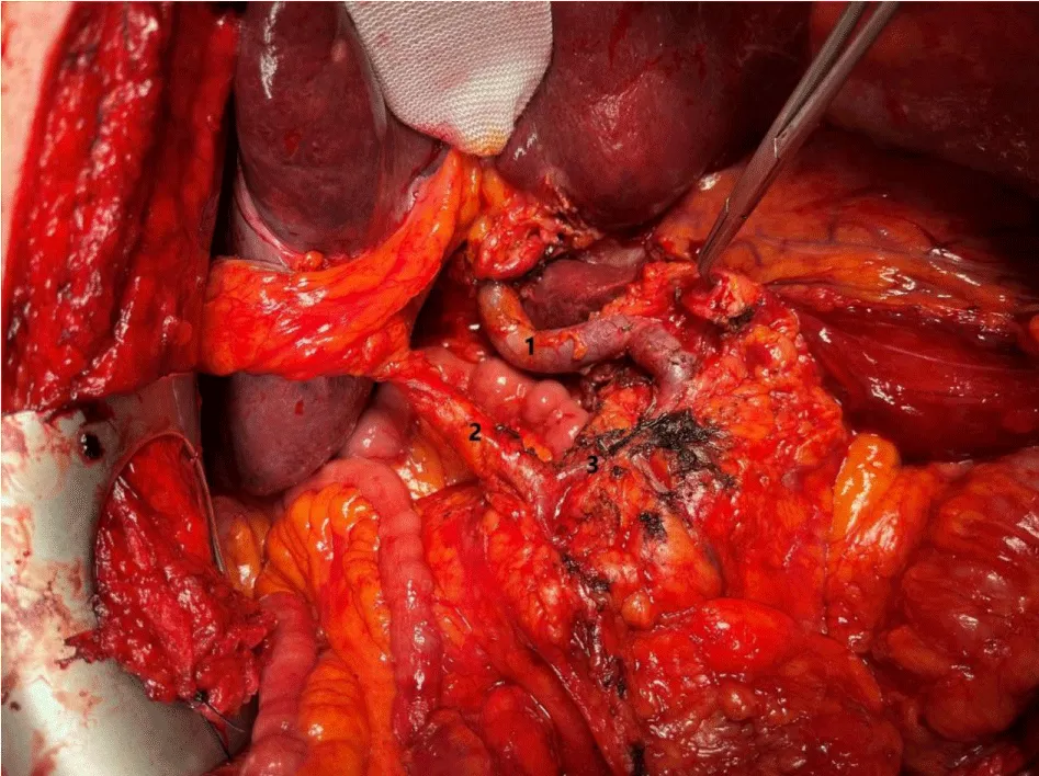 Figure 5: Situs after resection; 1 regular portal vein; 2 accessory portal vein; 3 extrahepatic anastomotic vein.