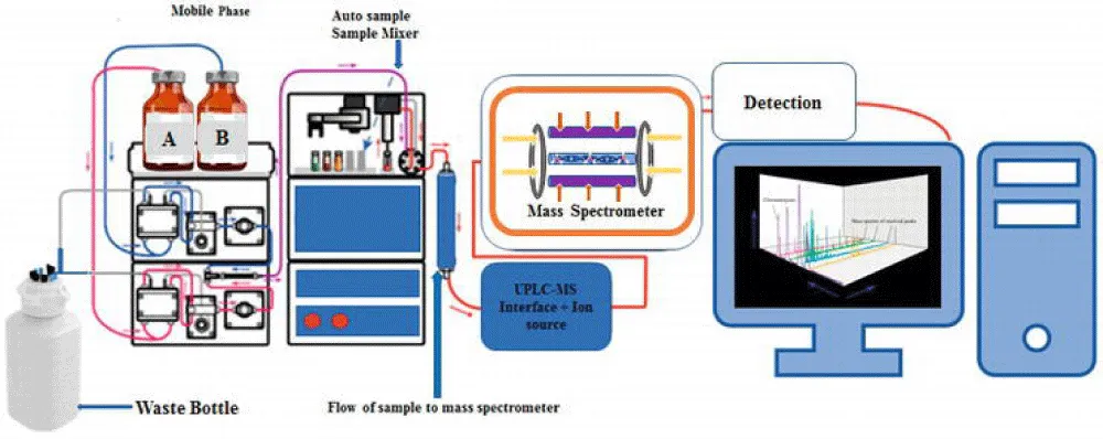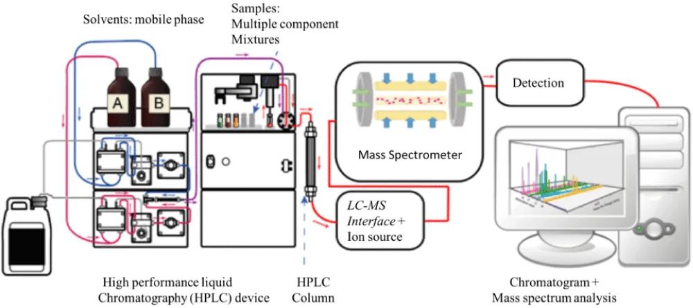 HPLC-MS is a standard technology for both researchers and industry experts, providing uncommon capabilities to analyze complex mixtures [64]. It is a versatile instrument that can handle a wide range of chemicals, from small molecules like pharmaceuticals to big macromolecules like proteins, making it useful in fields such as drug development, environmental studies, and food science [65]. HPLC separates chemicals based on their interactions with the stationary and mobile phase, enabling the separation, identification and quantification of individual components in complex samples [25]. Modern MS detectors, particularly tandem MS (MS/MS), are extremely sensitive, allowing the identification of trace-level analytes even in challenging matrices [66]. MS extracts structural information from molecules based on their fragmentation patterns. This is critical for identifying new compounds and understanding their characteristics. The technique has become more accessible to a larger variety of academics and aiding high-throughput analysis with the development of smaller, more automated HPLC-MS equipment [2] (Figure 3).
