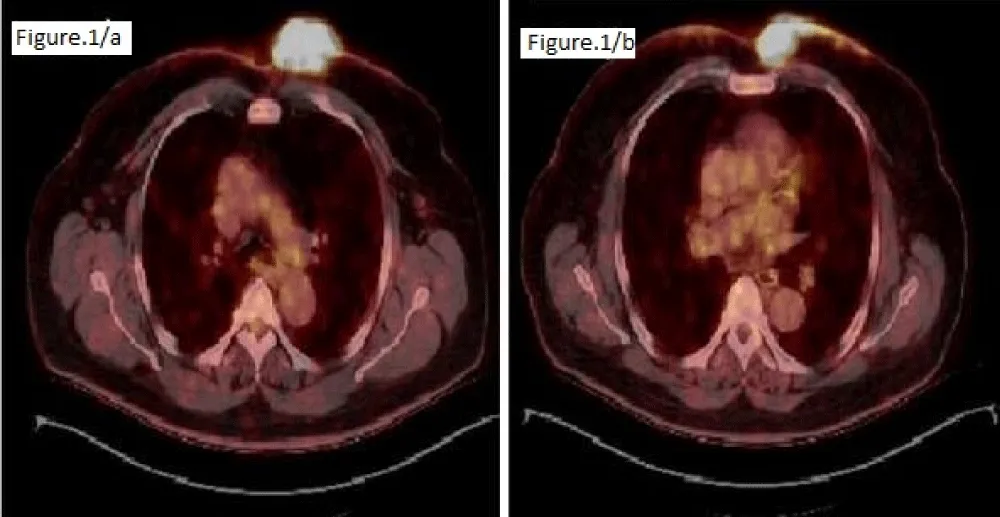 A 65-year-old man presented to the dermatology clinic with complaints of a large erythematous plaque on the anterior chest that had been gradually increasing for two months. He had a history of gout, hypertension, and inflammatory bowel disease, and a history of renal cystectomy and lumbar disc herniation. A biopsy revealed atypical lymphoid infiltration consistent with CD5-negative non-Hodgkin’s B-cell lymphoma, with diffuse CD20 positivity, focal BCL-6 and CD10 positivity, and negative CD34, CD117, TDT, and p63 positivity, extending from the superficial dermis to the subcutaneous fat. The patient was referred to the hematology department. The patient, who had no symptoms, had a PET-CT scan of the left hemithorax. A 57 x 74 mm irregular mass infiltrating the skin/subcutaneous tissue and bilateral (prominent on the left) multifocal skin thickening reaching approximately 9 mm on the anterior chest wall was observed (Figure 1). No systemic involvement was detected, and the patient was referred for RT without considering chemotherapy, phototherapy, or cryotherapy. The patient was treated with the Linac device using an intensity-modulated RT technique using 6 MV photon energy. A boost of 30 Gy/17 fractions was applied to the extensive lesions on the anterior chest wall, and a boost of 20 Gy/11 fractions was applied to the primary mass. Post-treatment physical examination revealed marked regression of the mass and disappearance of the erythematous lesions. A one-month CT scan revealed marked regression of the primary mass and a complete response in the smaller lesions. Six months later, the lesions were reported to have completely disappeared (Figure 2).