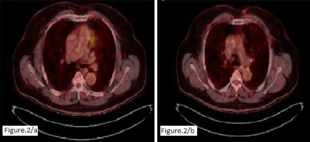 Figure 1: Intense hypermetabolic activity corresponding to irregular areas of thickening with focal nodular formations in the cutaneous tissue of the anterior chest wall, more prominent on the left side.