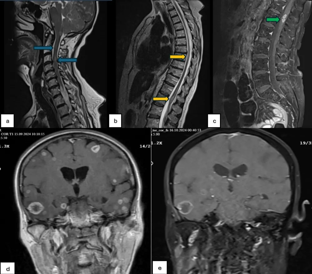 In 2024, 3 months after her last chemotherapy treatment, she developed a headache, nausea, and vomiting. The patient presented to our hospital’s emergency department after experiencing difficulty walking and speaking, bilateral weakness in the lower extremities, and increasing headaches. A contrast-enhanced cranial magnetic resonance imaging (MRI) revealed multiple metastatic foci scattered throughout the brain. After evaluation by a neurosurgeon, the patient was referred to our clinic.